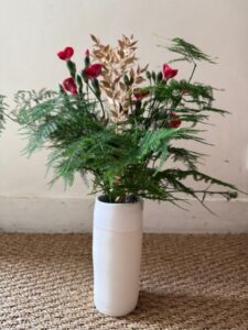 Notre bouquet a été réalisé par une fleuriste engagée : rose & chardon à Meudon. Il nous a coûté 10 €. Et pour être local jusqu’au bout, nous avons installé notre bouquet dans un vase confectionné par Aude Loison, une céramiste meudonnaise dans son atelier Blanc de Meudon. La simplicité du vase met bien en valeur le bouquet.