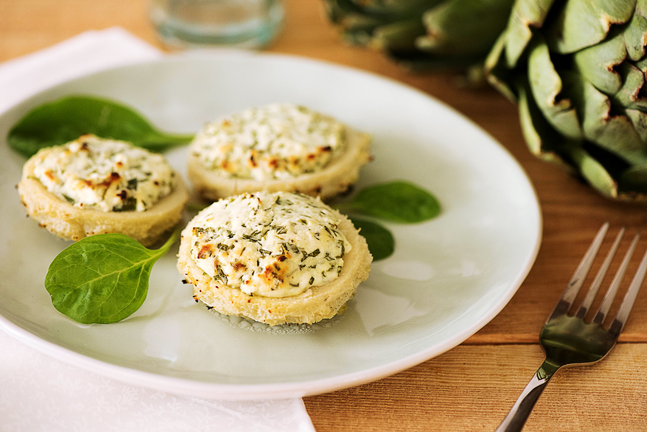 Coeurs d'artichaut gratinés au chèvre et aux épinards