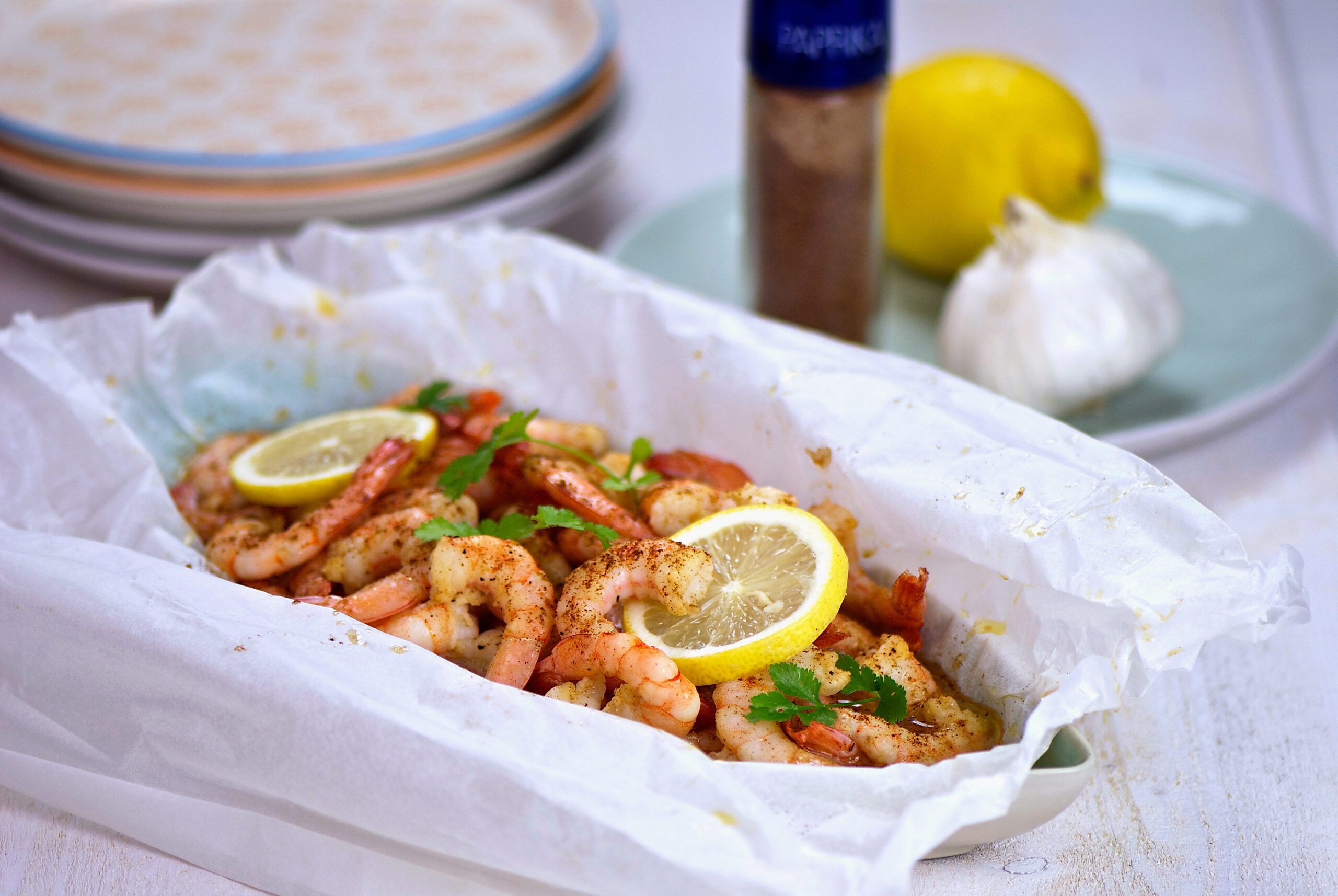 Crevettes au citron et paprika en papillote
