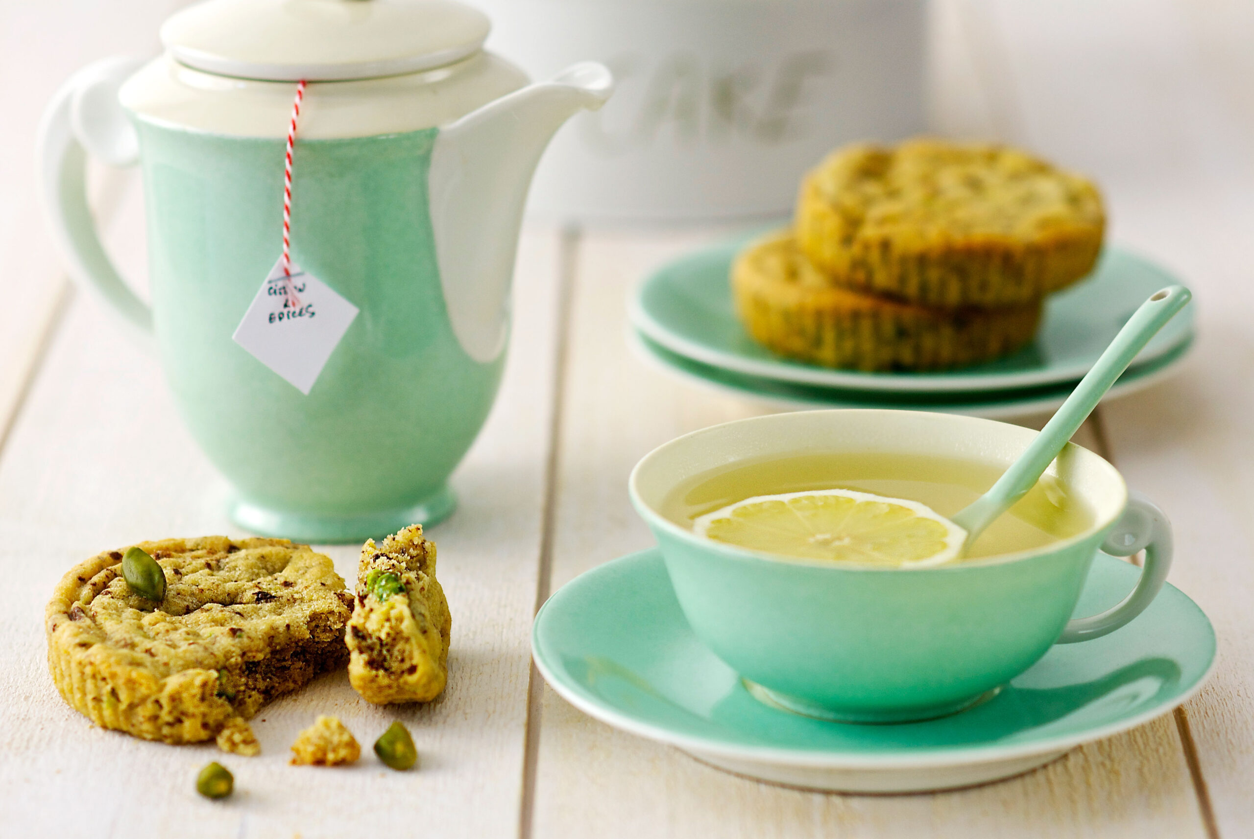 Infusion au citron et épices, et biscuits très pistache